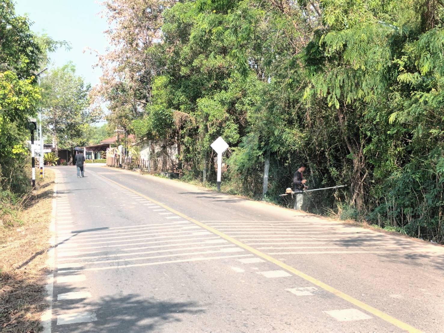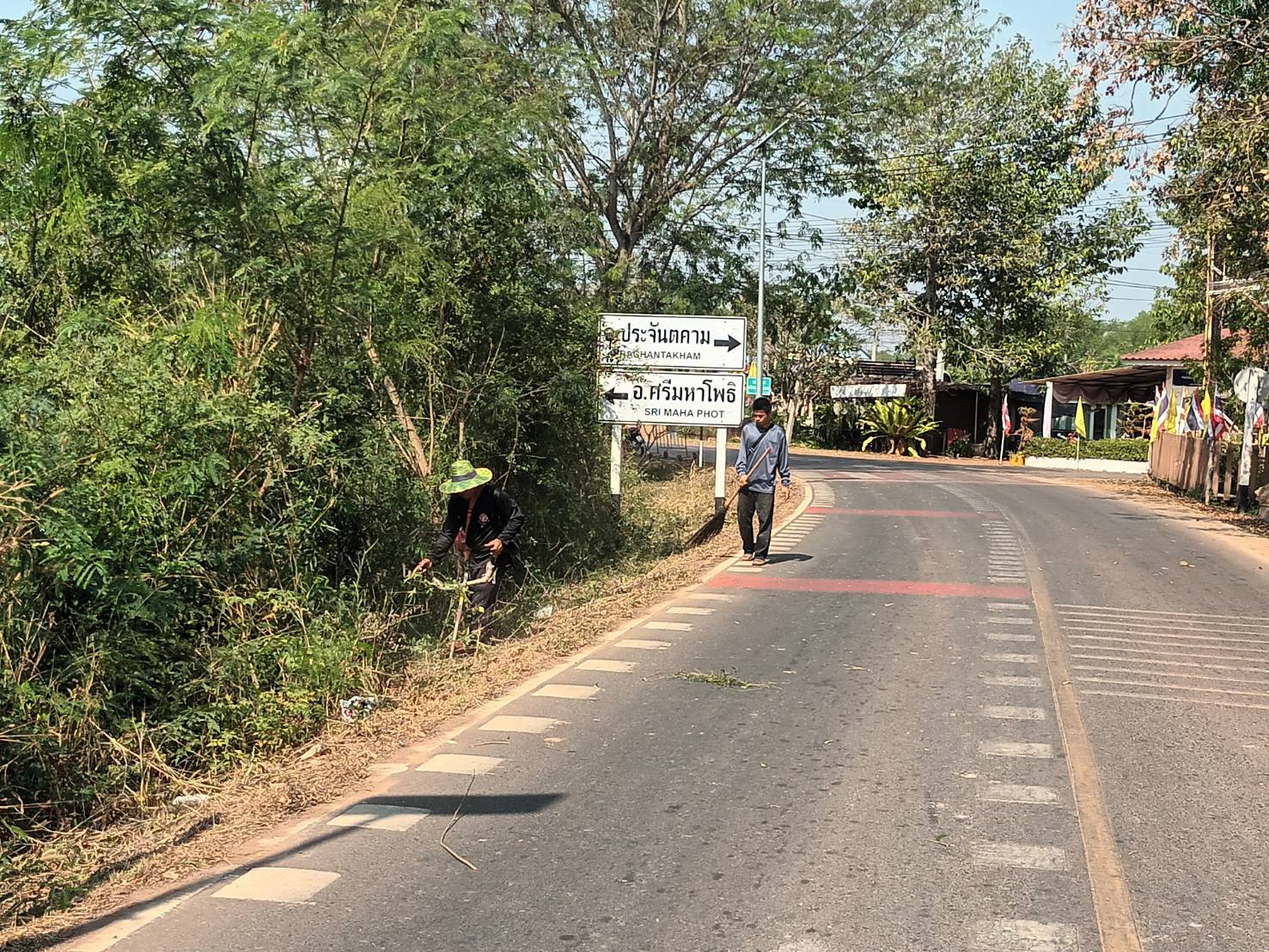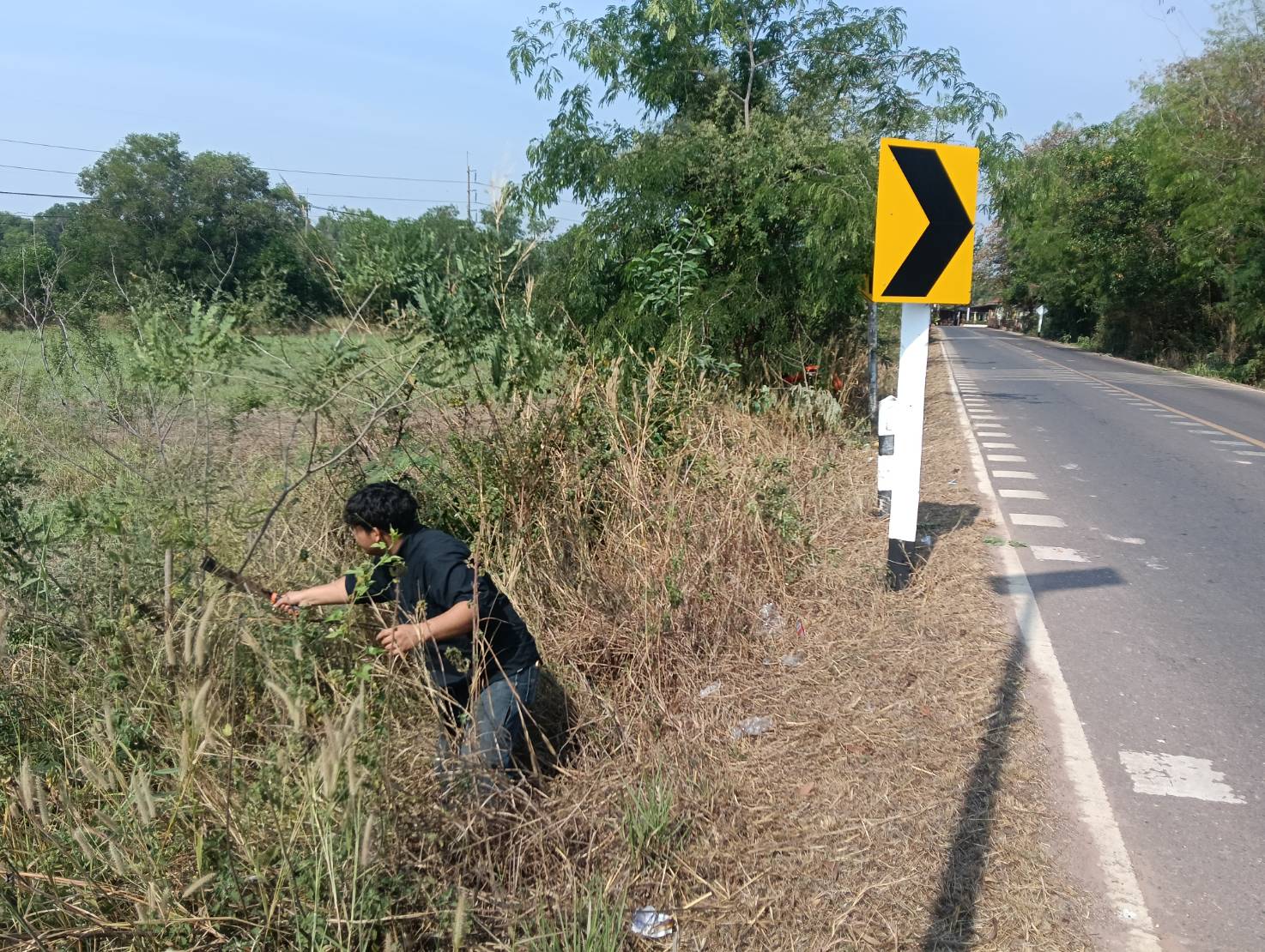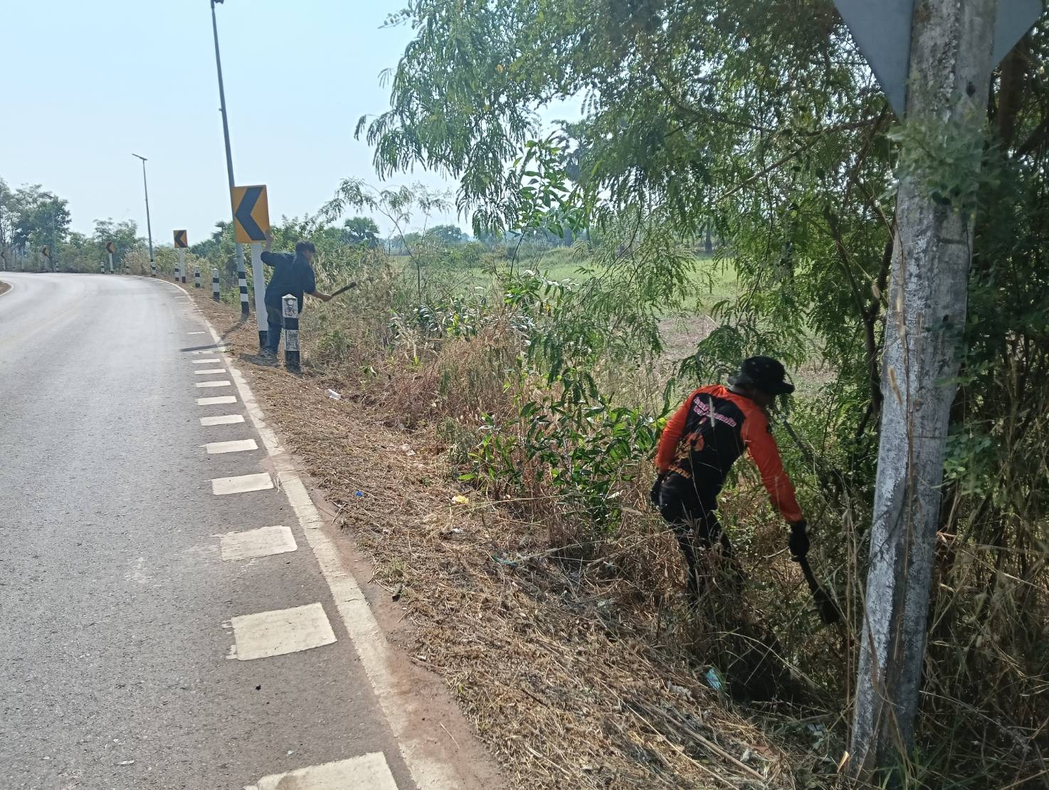เจ้าหน้าที่ป้องกันและบรรเทาสาธารณะภัย สำนักปลัด องค์การบริหารส่วนตำบลประจันตคาม อ.ประจันตคาม จ.ปราจีนบุรี ระดมกำลังช่วยกันตัดหญ้าไหล่ทางและเก็บขยะริมถนนบริเวณเส้นหลังอบต.หมู่ที่ 4