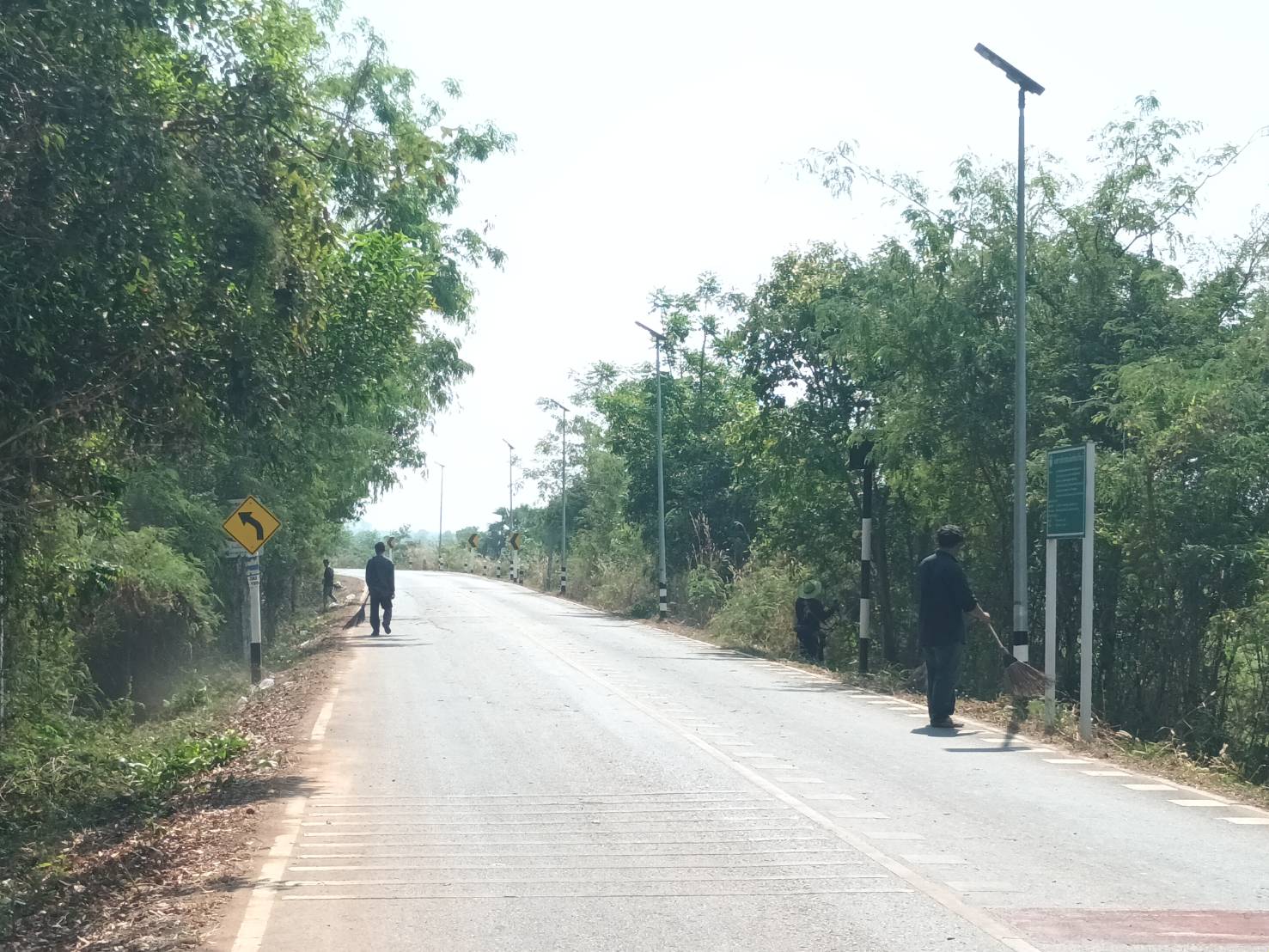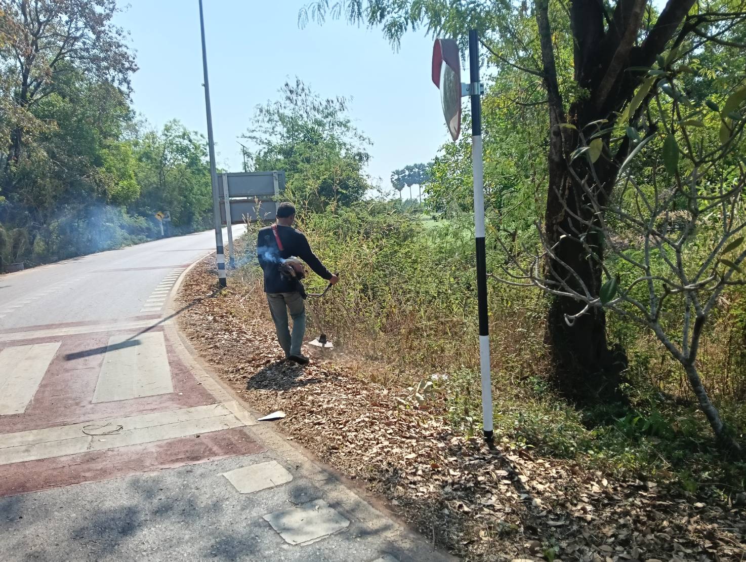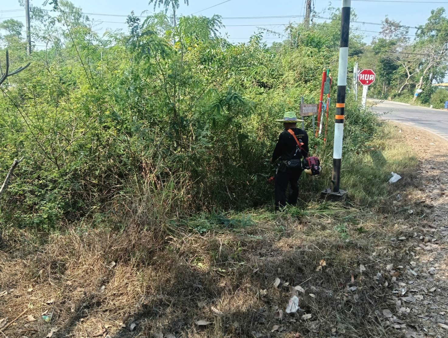 เจ้าหน้าที่ป้องกันและบรรเทาสาธารณะภัย สำนักปลัด องค์การบริหารส่วนตำบลประจันตคาม อ.ประจันตคาม จ.ปราจีนบุรี ระดมกำลังช่วยกันตัดหญ้าไหล่ทางและเก็บขยะริมถนนบริเวณเส้นหลังอบต.หมู่ที่ 4